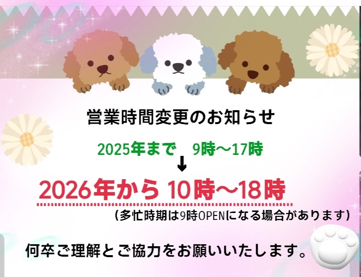 ※長らく(年単位で)ご来店のなかったわんちゃんにつきましては、状態によってはお引き受けできない場合がございます。(慣れない事による暴れ・噛みつき、過度の緊張による体調不良など、安全が保障できない為)